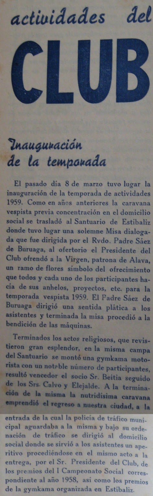 En los origenes del Club, esta salida siempre era la primera de año y se realizaba al principio de la temporada que solía ser en marzo, ya que el Club paraba sus actividades de las salidas entre noviembre y marzo. Era una salida muy intensa de actividades con misa en el Santuario, bendición de las motos y posterior ofrenda de flores a la Virgen de Estibaliz. (Leer el articulo de la época).