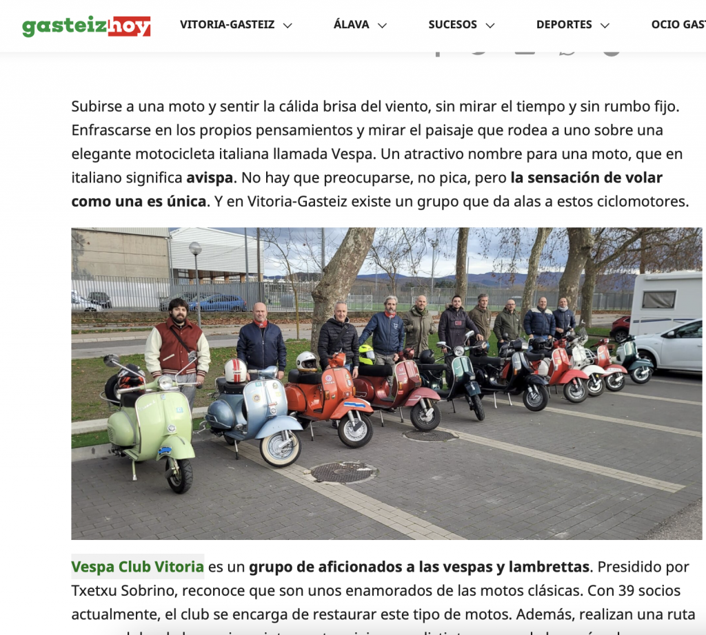El articulo empieza «Subirse a una moto y sentir la cálida brisa del viento, sin mirar el tiempo y sin rumbo fijo. Enfrascarse en los propios pensamientos y mirar el paisaje que rodea a uno sobre una elegante motocicleta italiana llamada Vespa. Un atractivo nombre para una moto, que en italiano significa avispa. No hay que preocuparse, no pica, pero la sensación de volar como una es única. Y en Vitoria-Gasteiz existe un grupo que da alas…» pero este es solo el principio os dejamos que lo leáis entero aquí.